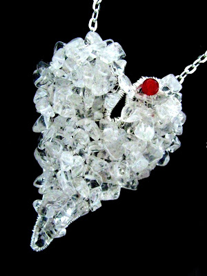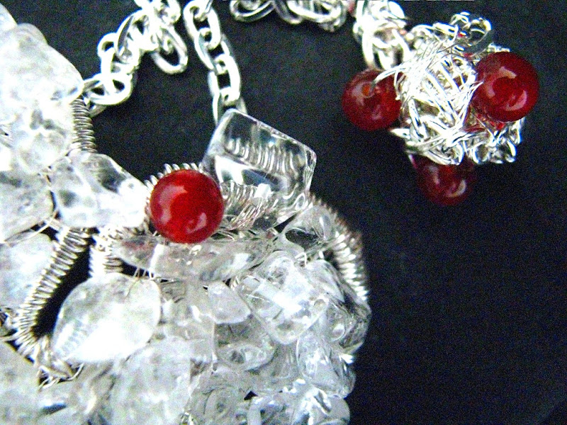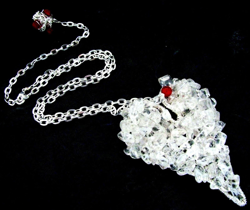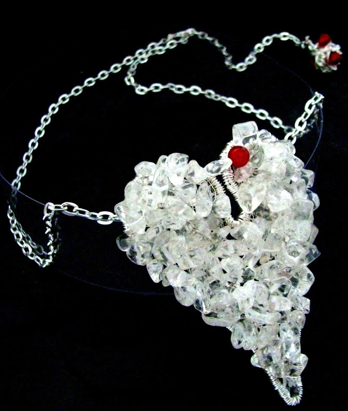 INIMA mea din metal placat cu argint ( sarma de 0.2mm,0.4 mm, 1 mm), asezonata cu cristal de stanca si agata de foc (6 mm), se insoteste bucuroasa cu un lant placat cu argint de aproximativ 50 cm lungime. Acesta isi incheie serpuirea intr-un ghem din lant, sarma si agate care sade frumos si cuminte pe spatele purtatoarei. Lantul se poate incheia in orice loc dorit, rezultand lungimea dorita de fiecare dupa bunul plac.