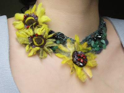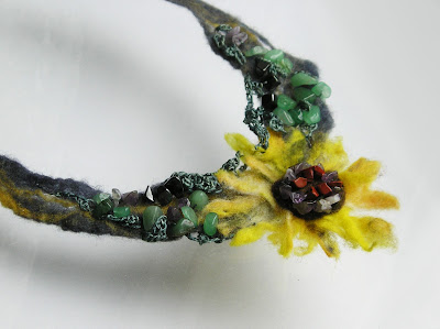 Colierul este “pictat” in tehnica mixta, cu texturi diferite si multe nuante de galben, portocaliu, verde, gri-albastrui, gri-violet.