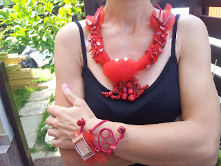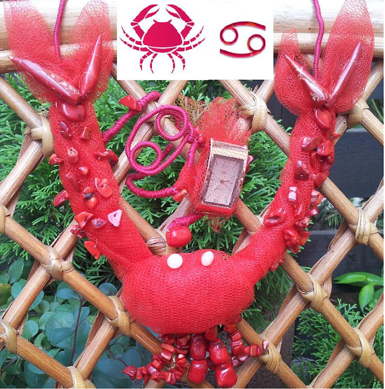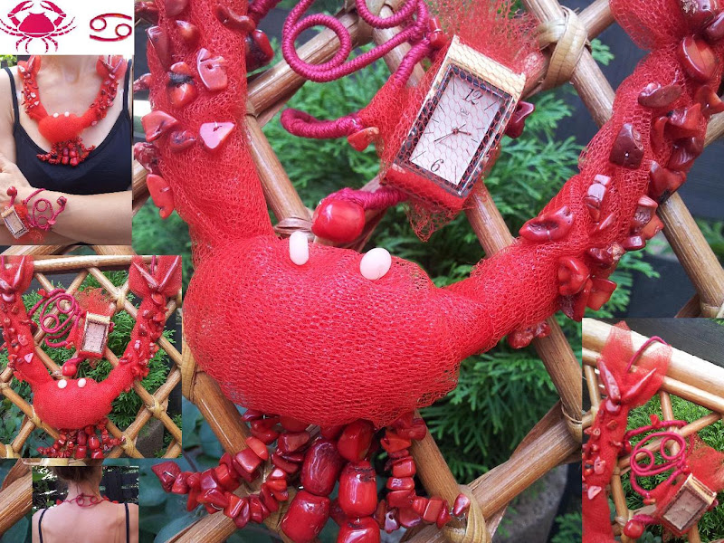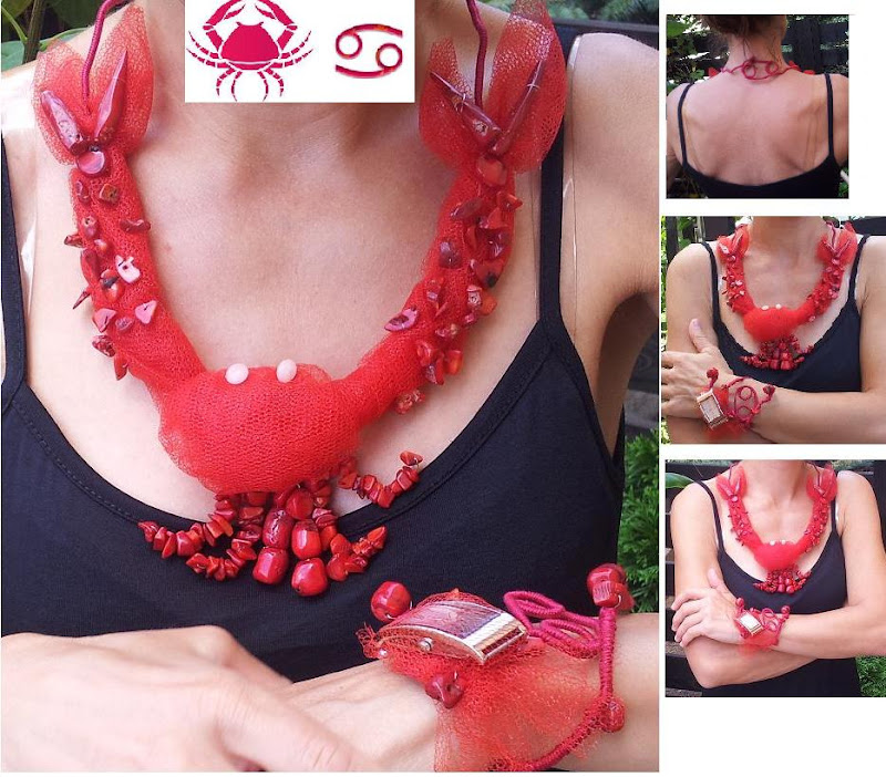 Stiu poezia pe de rost si am inceput sa rasucesc tulul diafan, din prima zi in care s-a anuntat acest concurs. Curand "am dat inapoi"- ca un "rac autentic", caci nu gaseam o idee pe care sa o leg de cerintele concursului: " culori si pietre specifice zodiei rac " ...Am luat de la un alt rac, Blanitza (sic!) cateva pietre de opal roz- piatra a creativitatii, a inspiratiei, a imaginatiei. Am cusut doua, sub forma de ochi vioi si m-am "tarat mai departe" pana ce "obosita de joc", am abandonat , caci lucrurile nu prindeau forma asa cum mi-as fi dorit. Pentru ca Racul e perseverent si pentru ca am vrut sa "ma laud cu zodia mea" , am lasat pesimismul zodiei la o parte, si am continuat sa asez si sa modelez pe sarma cu memorie simbolul cunoscut al zodiei. Pentru independenta si liberalism- trasaturi caracteristice aceste zodii- am indraznit sa renunt la culorile recomandate si am ales rosul - e energizant pentru mine, nativ al acestei zodii! - apoi am cusut de-a lungul clestilor, margele de coral rosu. Rosul este culoarea iubirii, iar Racul este prin excelenta semnul sensibilitatii si fertilitatii... Am adaugat ceasul gandindu-ma la alte "umbre ale cuvintelor" lui Octavian Paler: "In iubire esti independent de timp, ca si-n copilarie", chiar daca Tic-Tac-ul aduna o "povara uriaşă (care poate) să mă ucidă într-o zi"...