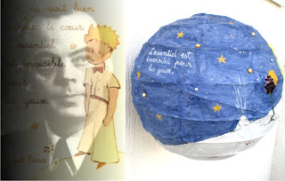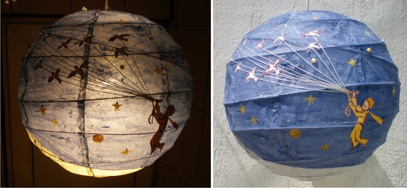 Decoratiunea pe care am facut-o cu mult drag inspirata de acest personaj reprezinta un glob din hartie (o lampa pentru camera unui „printisor” rac) pe care am pictat (pornind de la desenele autorului) cu culori acrilice, am lipit imagini printate si pietricele specifice zodiei : perle galbene si argintii (reprezentand stele) si granat pentru realizarea petalelor trandafirului.